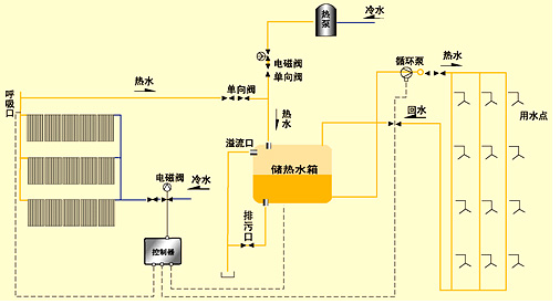 工作原理:在光照條件下將太陽能集熱器采集的熱量儲存并加熱水(或其他介質)使之溫度升高,再將含有高能量的水或介質送入儲熱容器內(水箱)。光照不足或無光照條件下用常規能源補償。